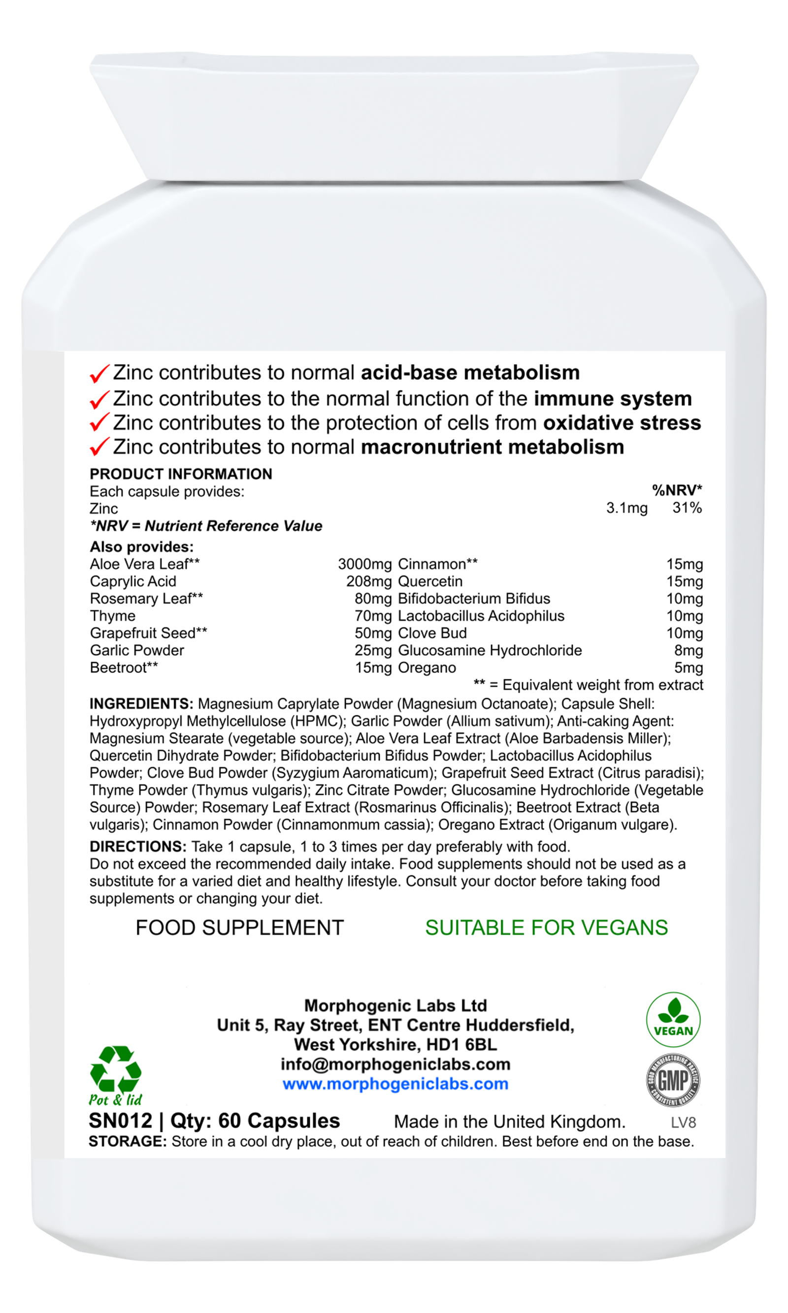 Ingredients: Magnesium Caprylate Powder (Magnesium Octanoate); Capsule Shell: Hydroxypropyl Methylcellulose (HPMC); Garlic Powder (Allium sativum); Anti-caking Agent: Magnesium Stearate (vegetable source); Aloe Vera Leaf Extract (Aloe Barbadensis Miller); Quercetin Dihydrate Powder; Bifidobacterium Bifidus Powder; Lactobacillus Acidophilus Powder; Clove Bud Powder (Syzygium Aaromaticum); Grapefruit Seed Extract (Citrus paradisi); Thyme Powder (Thymus vulgaris); Zinc Citrate Powder; Glucosamine Hydrochloride (Vegetable Source) Powder; Rosemary Leaf Extract (Rosmarinus Officinalis); Beetroot Extract (Beta vulgaris); Cinnamon Powder (Cinnamonmum cassia); Oregano Extract (Origanum vulgare).