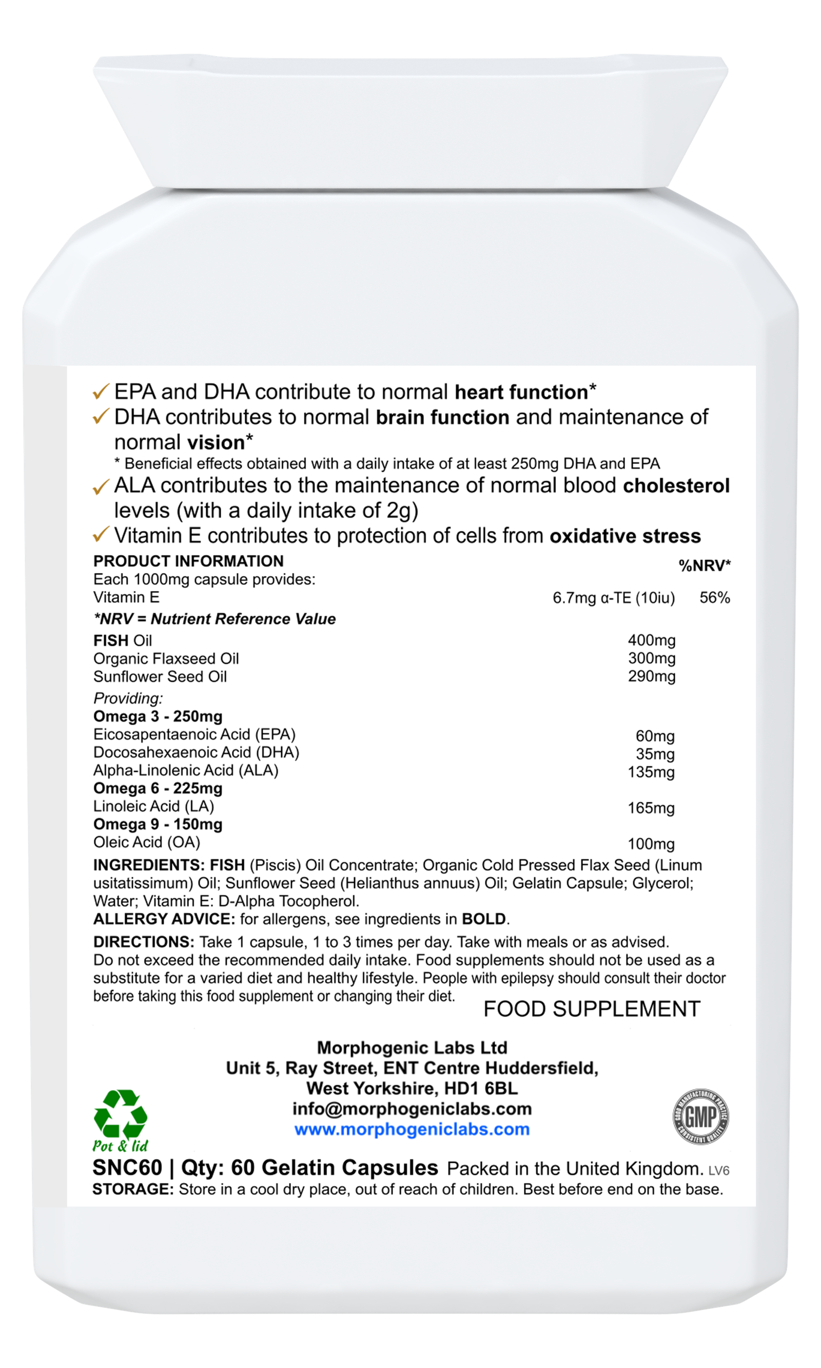 Ingredients: FISH (Piscis) Oil Concentrate; Organic Cold Pressed Flax Seed (Linum usitatissimum) Oil; Sunflower Seed (Helianthus annuus) Oil; Gelatin Capsule; Glycerol; Water; Vitamin E: D-Alpha Tocopherol.