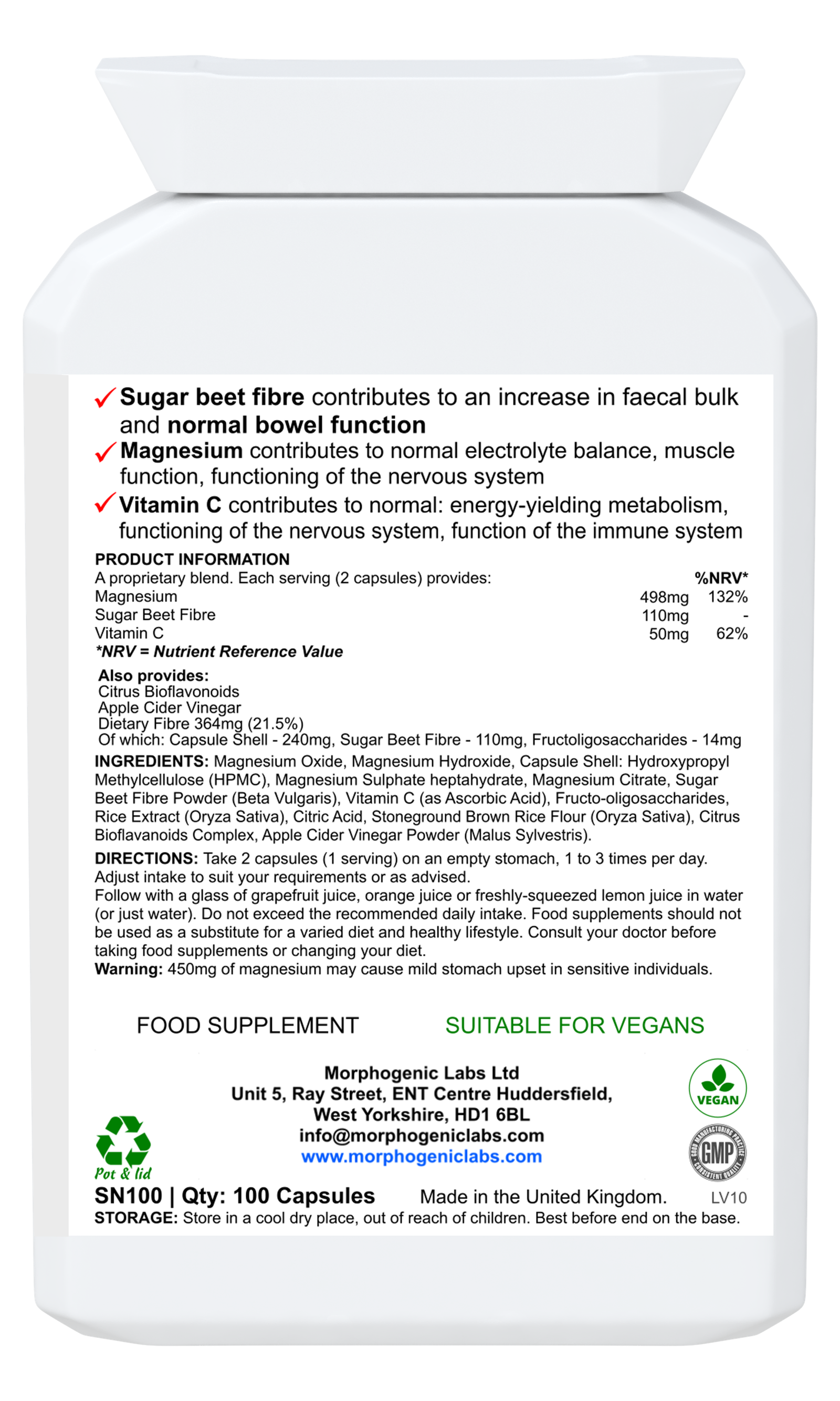 Ingredients: Magnesium Oxide, Magnesium Hydroxide, Capsule Shell: Hydroxypropyl Methylcellulose (HPMC), Magnesium Sulphate heptahydrate, Magnesium Citrate, Sugar Beet Fibre Powder (Beta Vulgaris), Vitamin C (as Ascorbic Acid), Fructo-oligosaccharides, Rice Extract (Oryza Sativa), Citric Acid, Stoneground Brown Rice Flour (Oryza Sativa), Citrus Bioflavanoids Complex, Apple Cider Vinegar Powder (Malus Sylvestris).