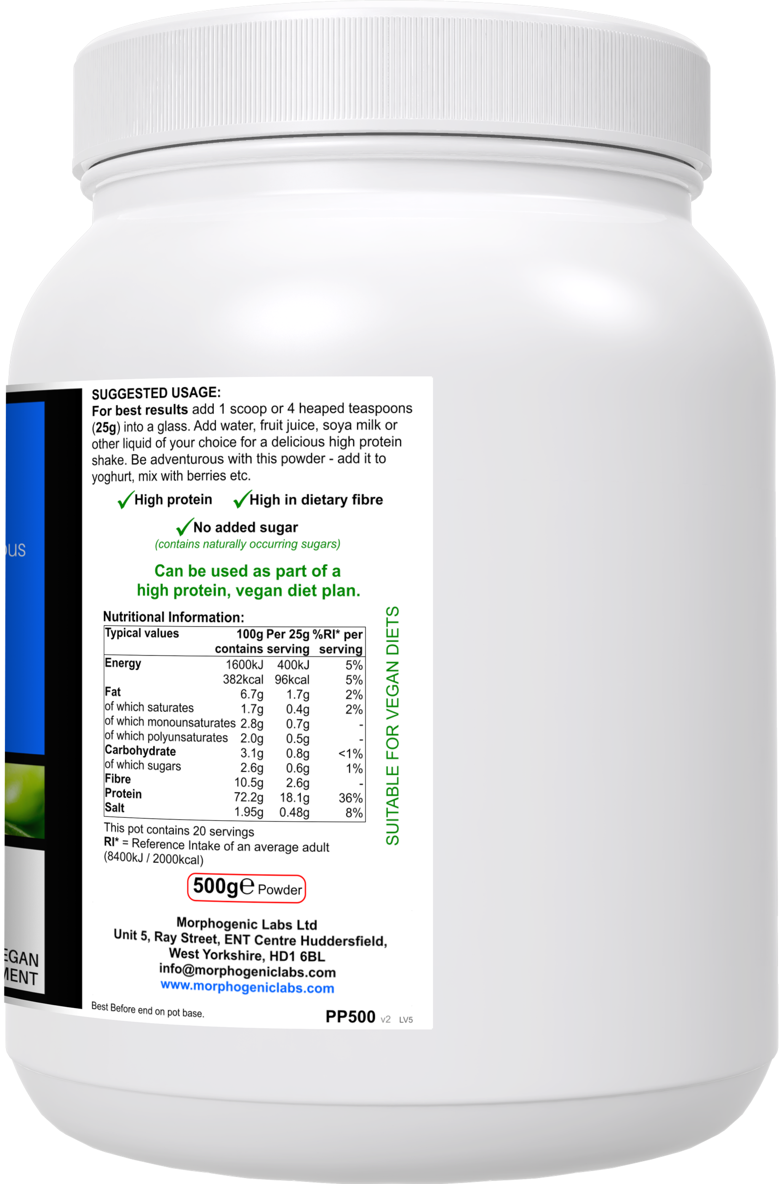 500g powder per pot – For best results add 1 scoop or 4 heaped teaspoons (25g) into a glass. Add water, fruit juice, soya milk or other liquid of your choice for a delicious high protein shake. Be adventurous with this powder – add it to yoghurt, mix with berries etc. Suitable for vegetarians and vegans