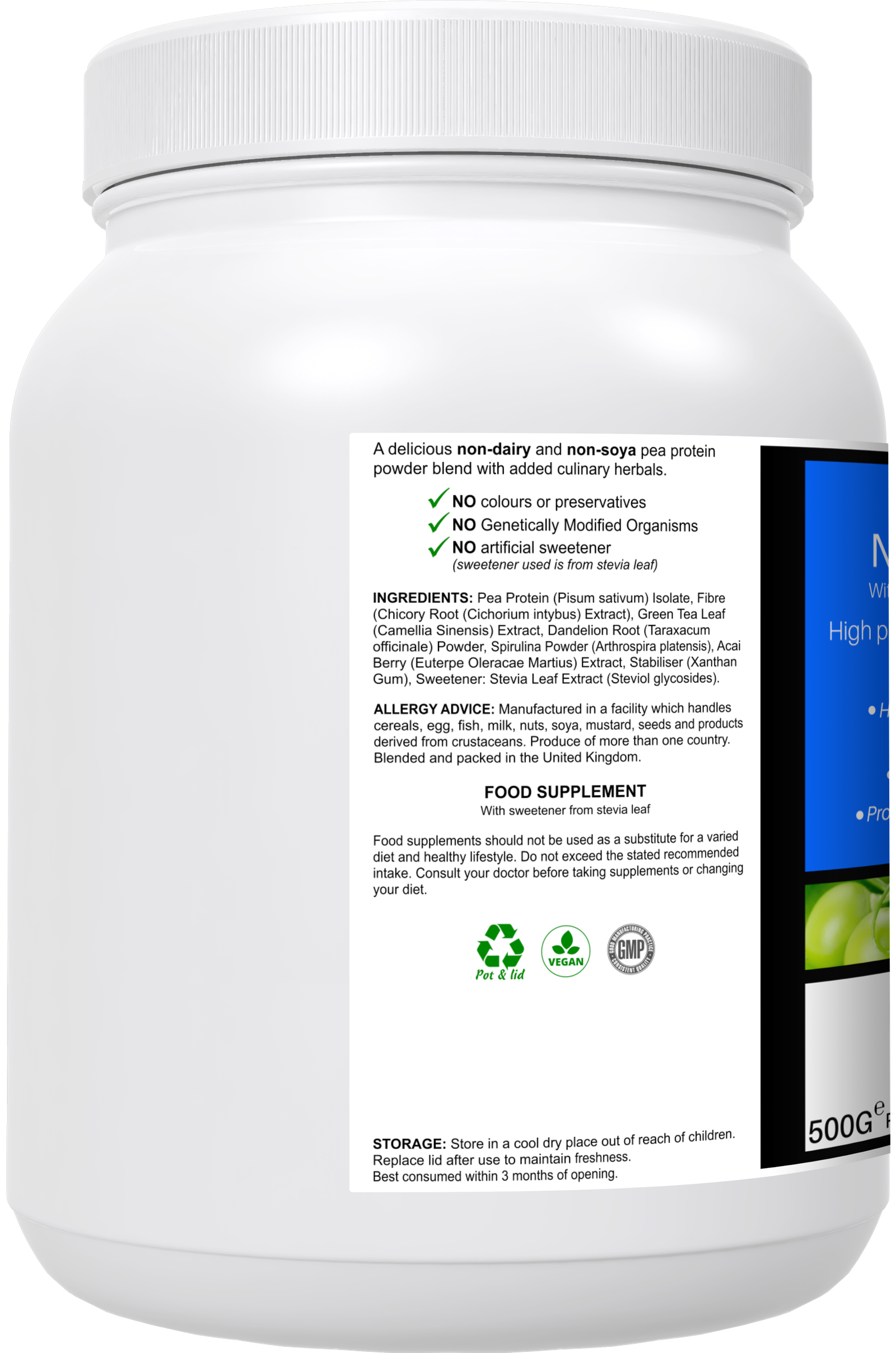 Ingredients: Pea Protein (Pisum sativum) Isolate, Fibre (Chicory Root (Cichorium intybus) Extract), Green Tea Leaf (Camellia Sinensis) Extract, Dandelion Root (Taraxacum officinale) Powder, Spirulina Powder (Arthrospira platensis), Acai Berry (Euterpe Oleracae Martius) Extract, Stabiliser (Xanthan Gum), Sweetener: Stevia Leaf Extract (Steviol glycosides).