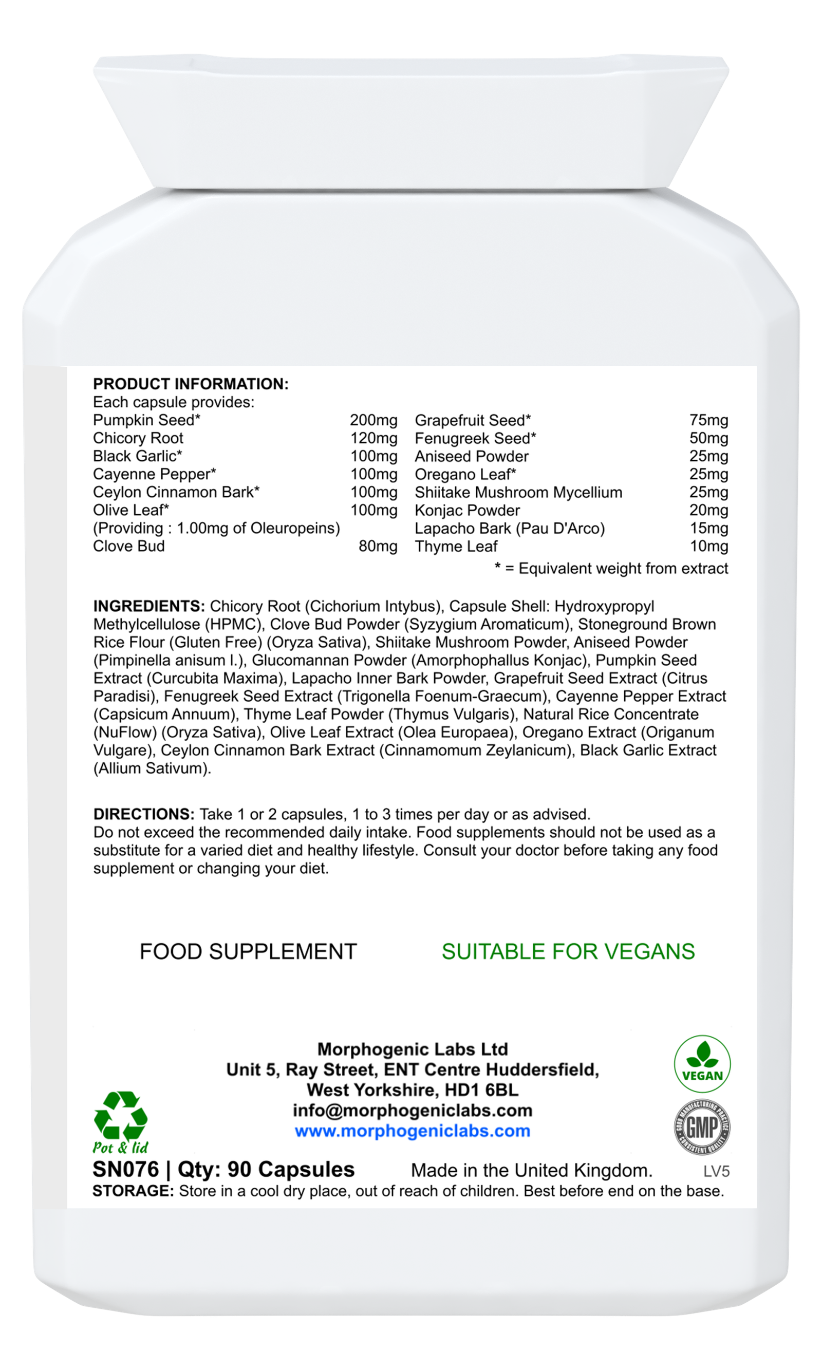 Ingredients: Chicory Root (Cichorium Intybus), Capsule Shell: Hydroxypropyl Methylcellulose (HPMC), Clove Bud Powder (Syzygium Aromaticum), Stoneground Brown Rice Flour (Gluten Free) (Oryza Sativa), Shiitake Mushroom Powder, Aniseed Powder (Pimpinella anisum l.), Glucomannan Powder (Amorphophallus Konjac), Pumpkin Seed Extract (Curcubita Maxima), Lapacho Inner Bark Powder, Grapefruit Seed Extract (Citrus Paradisi), Fenugreek Seed Extract (Trigonella Foenum-Graecum), Cayenne Pepper Extract (Capsicum Annuum), Thyme Leaf Powder (Thymus Vulgaris), Natural Rice Concentrate (NuFlow) (Oryza Sativa), Olive Leaf Extract (Olea Europaea), Oregano Extract (Origanum Vulgare), Ceylon Cinnamon Bark Extract (Cinnamomum Zeylanicum), Black Garlic Extract (Allium Sativum).